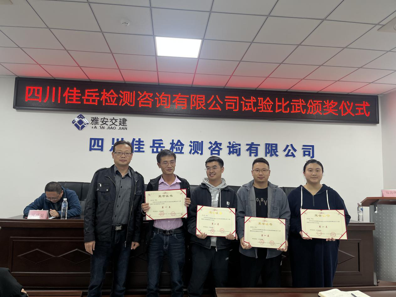 四川佳岳检测咨询有限公司第一届试验检测技能比武大赛自10月17日开赛以来,来自四川佳岳检测咨询有限公司和雅安市重点工程监理单位、工程试验室的员工持续参加比赛,历时21天,取得圆满成功。本次比赛项目设个人赛7项、团体赛1项,其中团体赛和个人赛分别设第一、二、三等奖项各1名。最终,佳岳公司以过硬的技能,取得团体赛第一名,个人赛第一名6项、第二名7项,第三名6项。