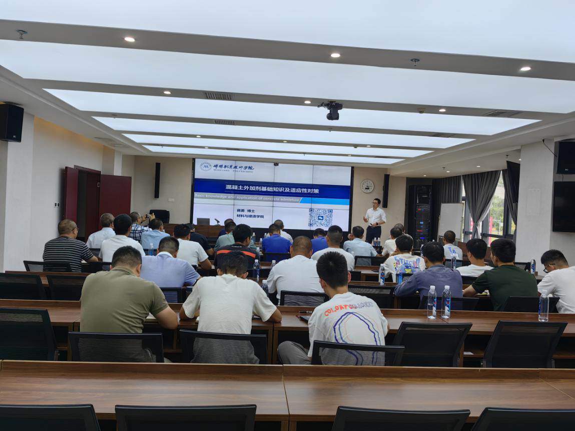 培训邀请绵阳职业技术学院材料与建造学院院长贾陆军、蒋勇两位博士授课,重点围绕配合比设计中需注意的事项展开,详细讲解配合比设计要点,分析原材料选择及矿粉、粉煤灰掺合料掺配比例的重要性,总结研讨机制砂在混凝土中的应用技术,讲解混凝土外加剂基础知识、分析现在外加剂在使用过程中适应性问题和原因,顺利获得真实案例分析混凝土质量问题的原因及管控要点等。