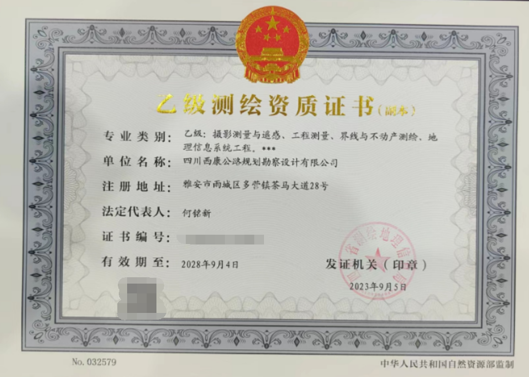 近期,经四川省测绘地理信息局批准,DB视讯 集团西康勘察设计有限公司取得测绘乙级资质证书,标志着公司在经营产业多元化和专业化开展上取得重要突破。 测绘乙级资质证书包含摄影测量与遥感、工程测量、界线与不动产测绘、地理信息系统工程四个专业,为公司拓宽经营市场和业务承揽能力、增加新的利润点奠定了坚实基础。 下一步,公司将不断提升专业技术水平,持续做实资质提升、增项相关工作,拓展业务经营范围,助力公司高质量开展。
