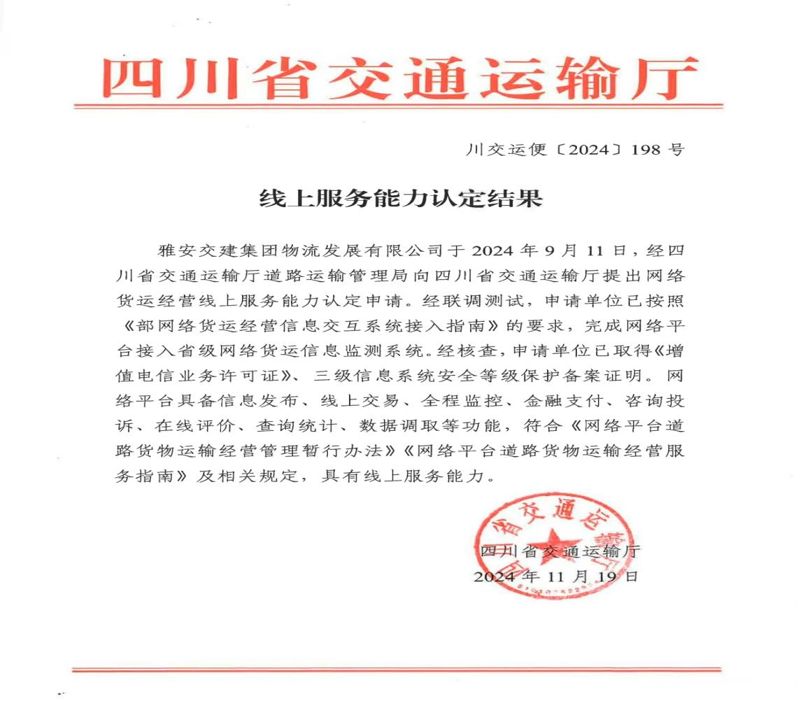 近期,《四川省交通运输厅线上服务能力认定结果》发布,DB视讯 集团物流开展有限公司正式取得网络货运经营线上服务能力认定,标志着雅安首家国企网络货运平台即将面向市场运营。