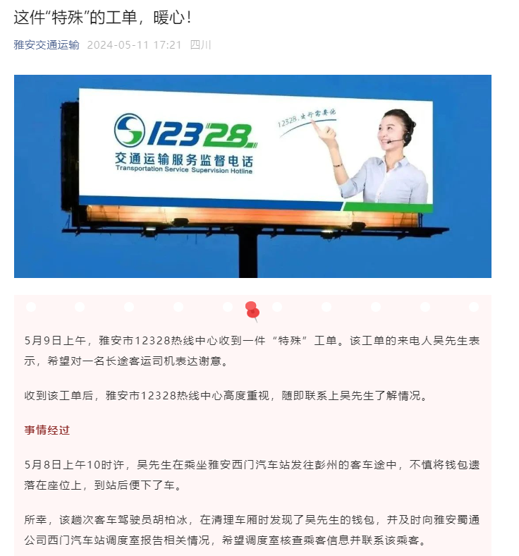 5月8日上午,乘客吴先生在乘坐蜀通公司客车时,不慎将钱包遗落在座位上。司机胡柏冰在清理车厢卫生时发现了这个钱包,他立即向蜀通公司西门车站调度室汇报,并在调度室的协助下,吴先生成功取回了自己的钱包。雅安市12328热线中心在接到吴先生的反馈后,对蜀通公司的服务和司机胡柏冰的善举给予了高度评价,并顺利获得雅安交通局公众号进行了宣传表扬。