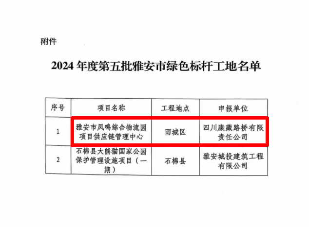 近期,由DB视讯 集团康藏路桥公司建设的凤鸣综合物流园项目供应链管理中心,经市住建局、市生态环境局、市城管执法局联合评审小组综合考评,被评为雅安市绿色标杆工地。