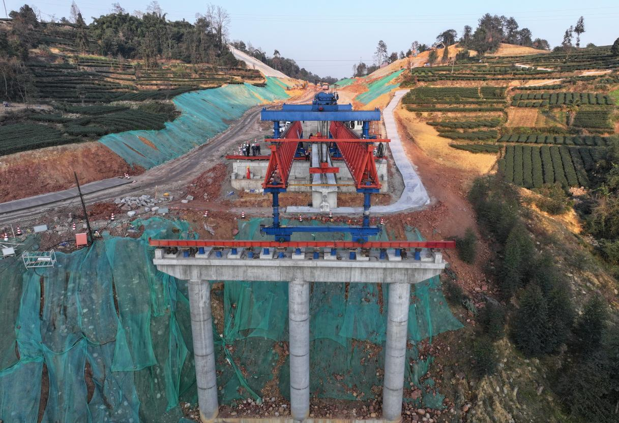 在桥梁建设方面,项目部面对桥位地形复杂、架设精度要求高、现场作业难度大等多重挑战,引入JQJ200-40A3型三角桁架双导梁架桥机进行梁体架设作业,该设备全长65.34米,高7.8米,采用全电控操作系统,具备机械化移梁、精准落梁等功能,可携边梁直接从中梁位置一次横移就位,实现了全断面机械化、