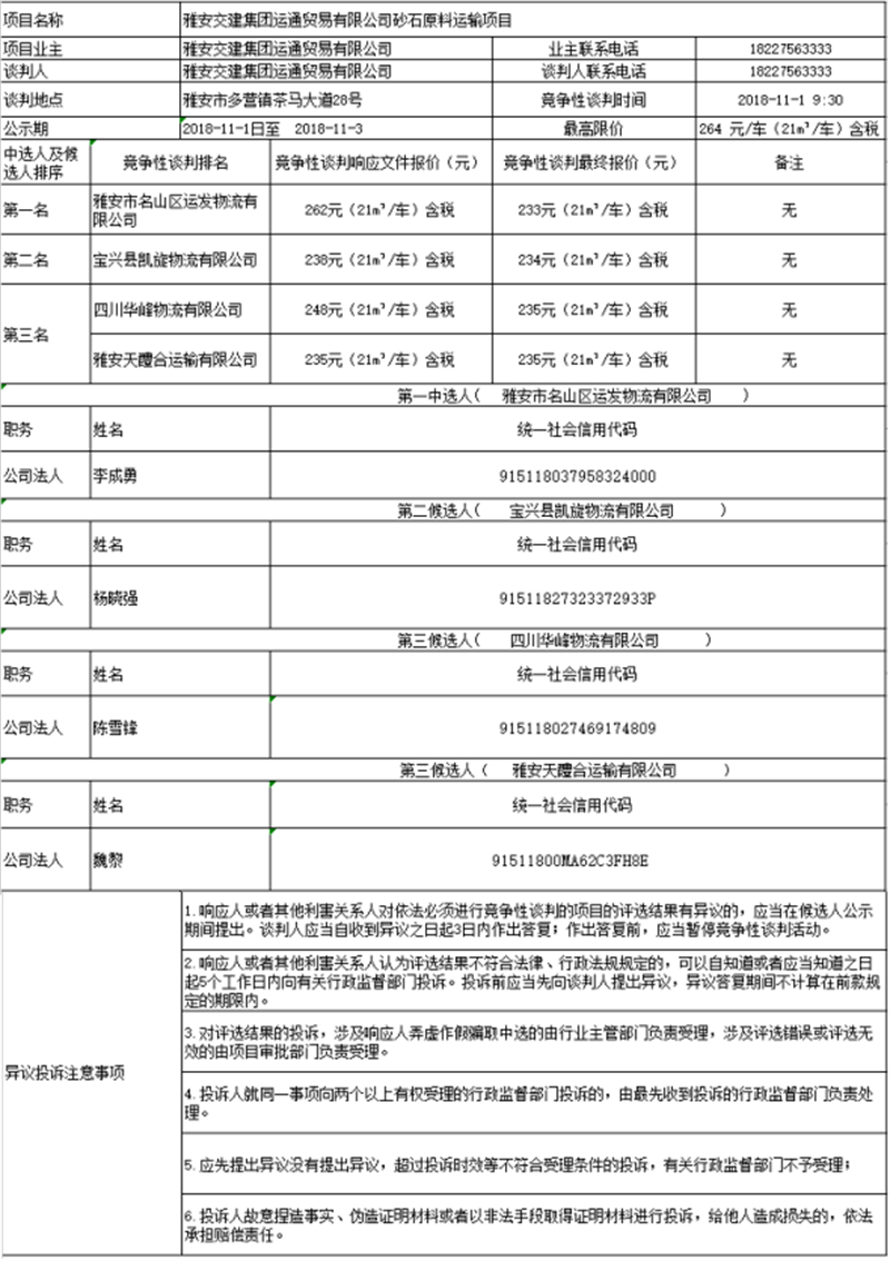 DB视讯 集团运通贸易有限公司砂石原料运输项目竞争性谈判中选人及候选人公示