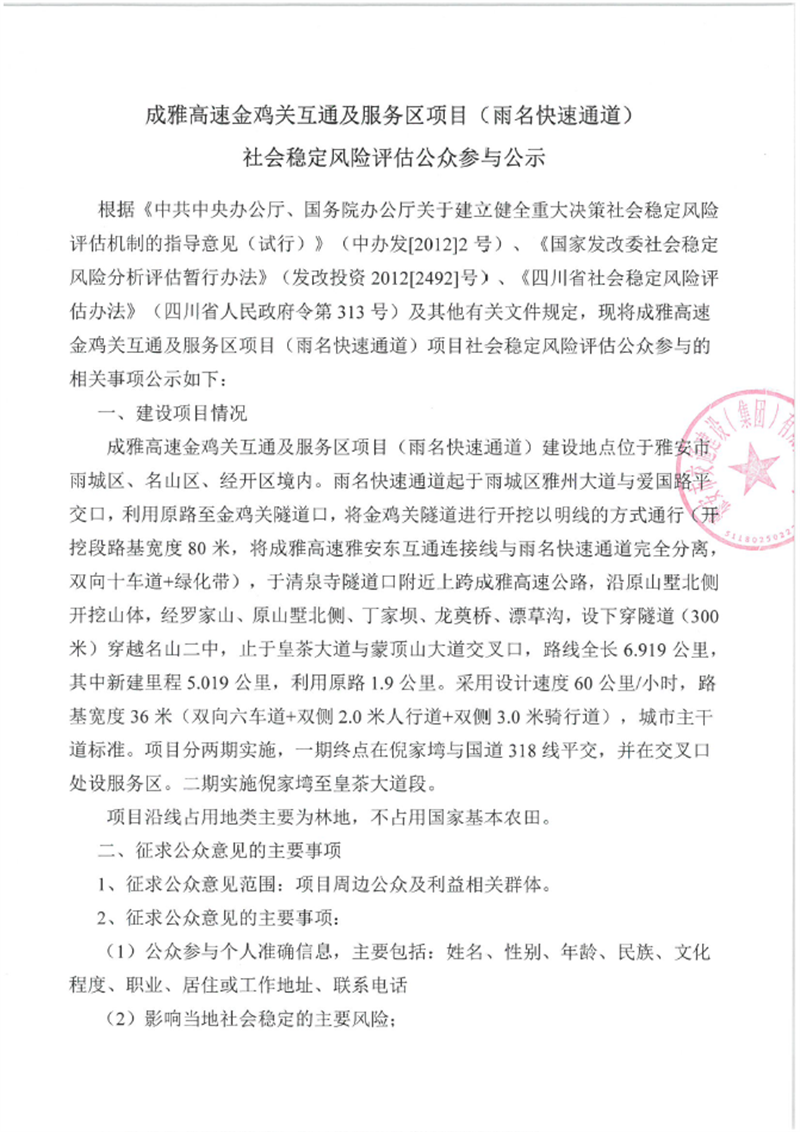 成雅高速金鸡关互通及服务区项目(雨名快速通道)社会稳定风险评估公众参与公示