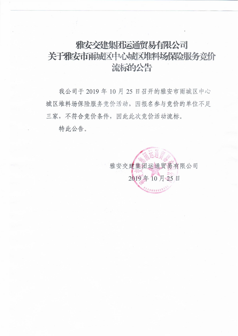DB视讯 集团运通贸易有限公司关于雅安市雨城区中心城区堆料场保险服务竞价流标的公告