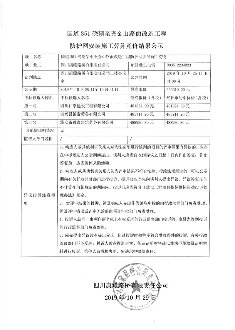 四川康藏路桥有限责任公司国道351硗碛至夹金山路面改造工程防护网安装施工劳务竞价结果公示
