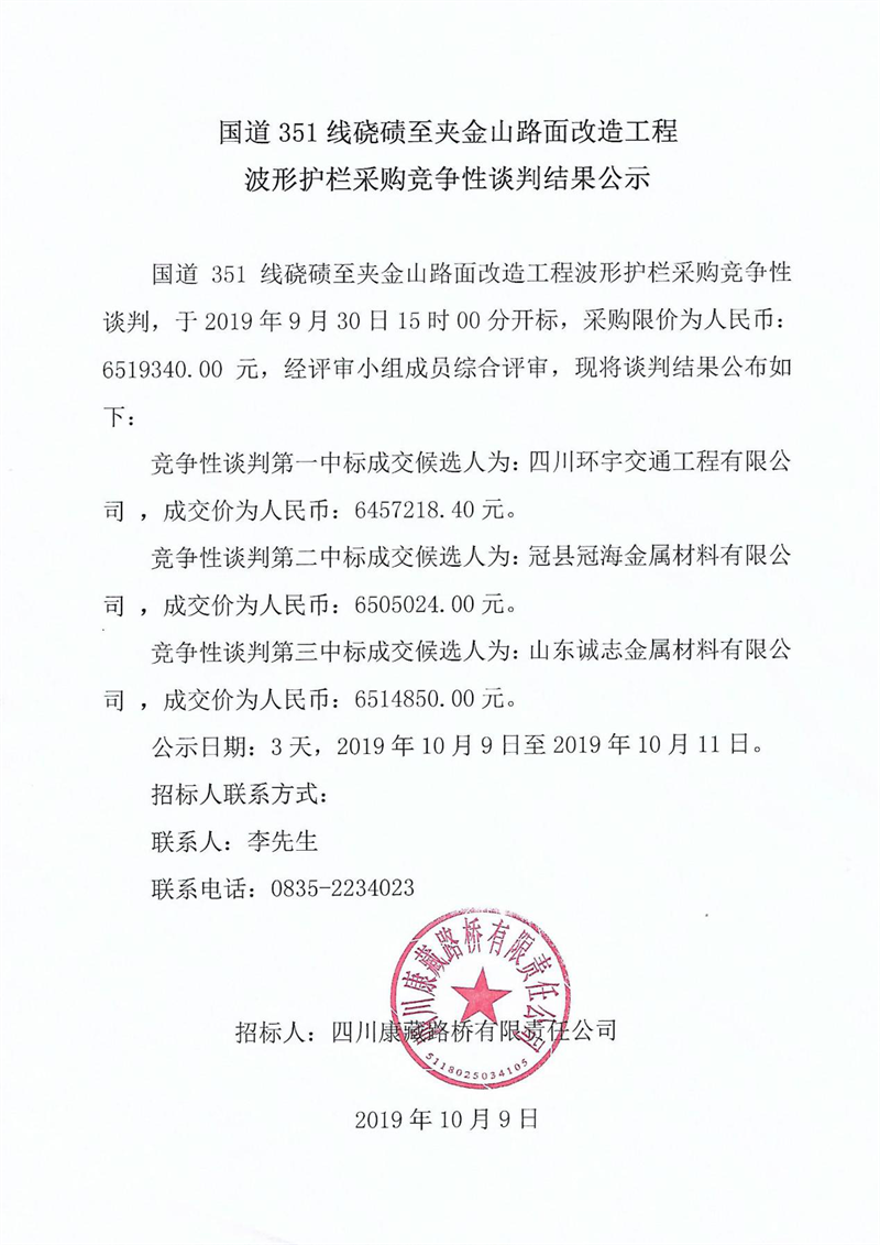四川康藏路桥有限责任公司国道351线硗碛至夹金山路面改造工程波形护栏采购竞争性谈判结果公示