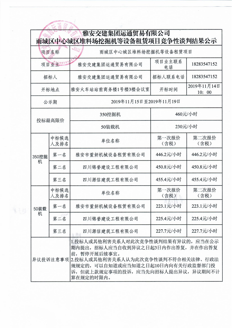 DB视讯 集团运通贸易有限公司雨城区中心城区堆料场挖掘机等设备租赁项目竞争性谈判结果公示