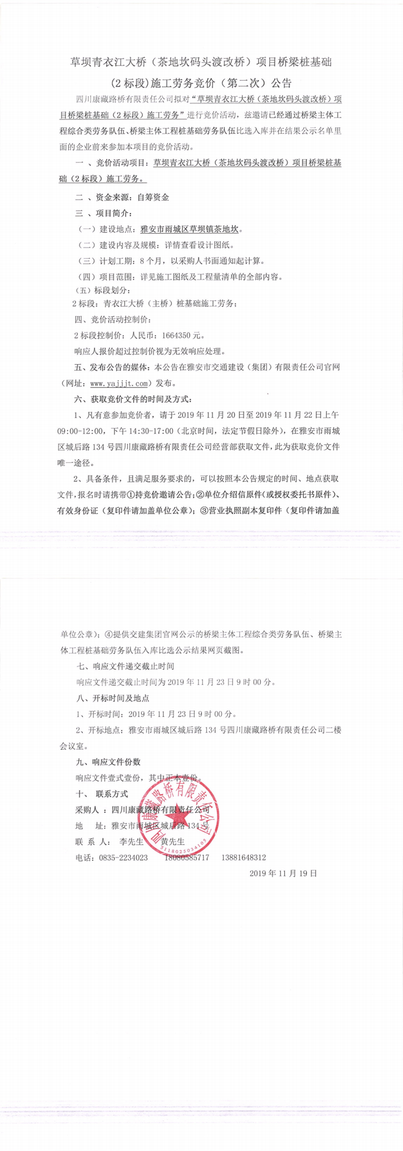 四川康藏路桥有限责任公司草坝青衣江大桥(茶地坎码头渡改桥)项目桥梁桩基础(2标段)施工劳务竞价(第二次)公告