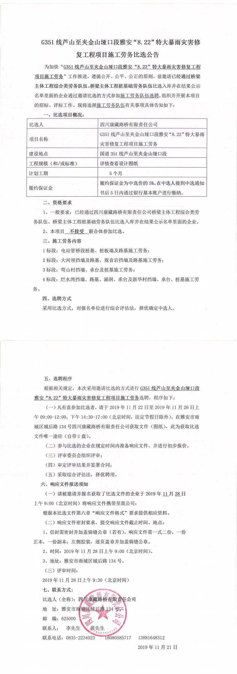 四川康藏路桥有限责任公司G351线芦山至夹金山垭口段雅安“8.22”特大暴雨灾害修复工程项目施工劳务比选公告