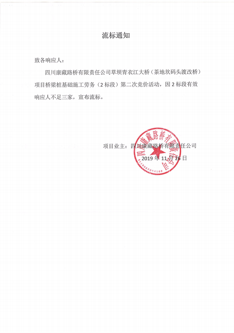 四川康藏路桥有限责任公司草坝青衣江大桥(茶地坎码头渡改桥)项目桥梁桩基础(2标段)施工劳务竞价(第二次)流标通知
