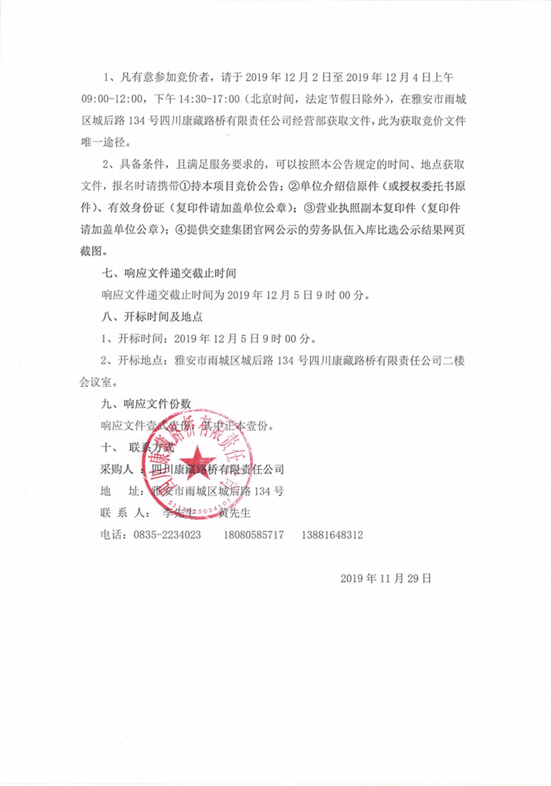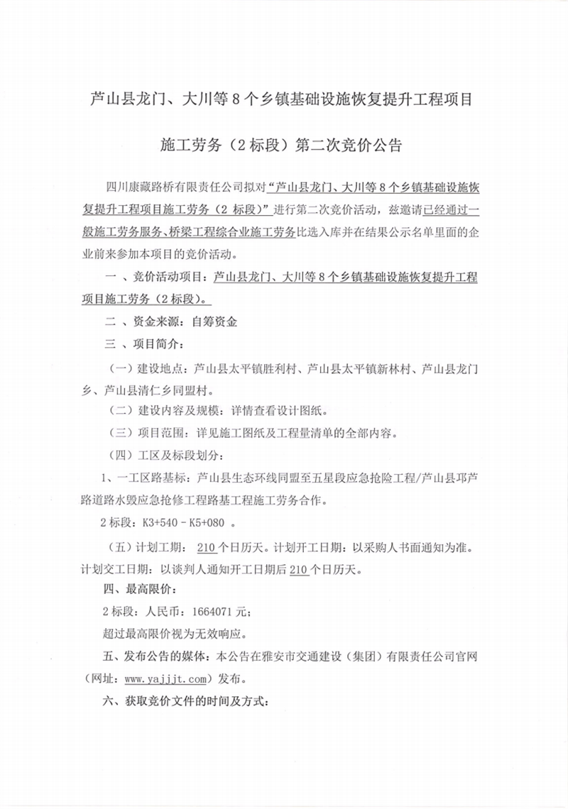 四川康藏路桥有限责任公司芦山县龙门、大川等8个乡镇基础设施恢复提升工程项目施工劳务(2标段)第二次竞价公告