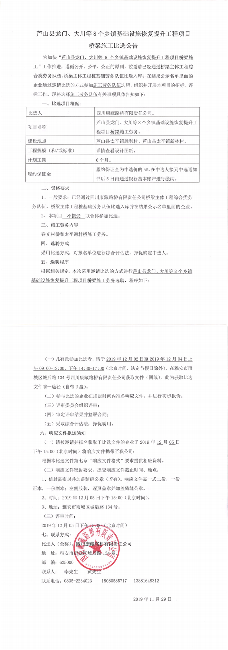 四川康藏路桥有限责任公司芦山县龙门、大川等8个乡镇基础设施恢复提升工程项目桥梁施工比选公告