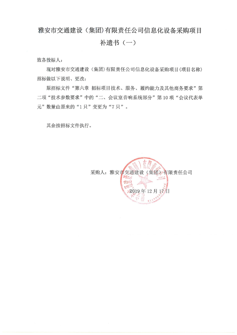 雅安市交通建设(集团)有限责任公司信息化设备采购项目补遗书(一)
