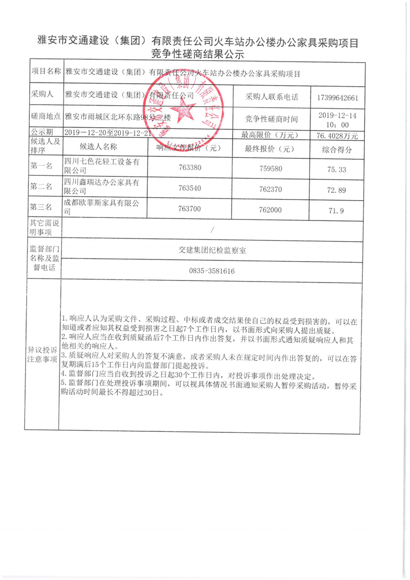 雅安市交通建设(集团)有限责任公司火车站办公楼办公家具采购项目竞争性磋商结果公示