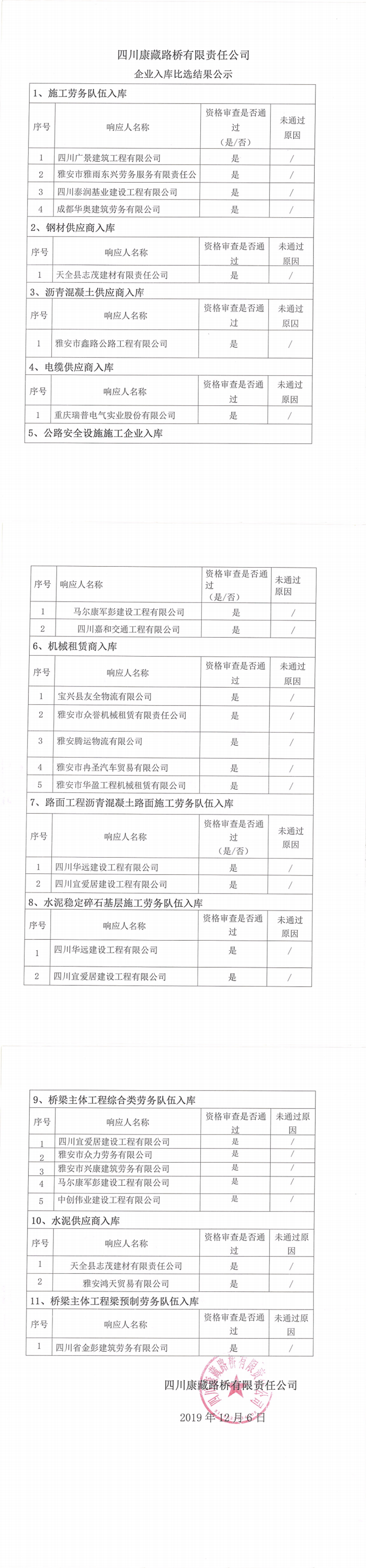 四川康藏路桥有限责任公司企业入库比选结果公示