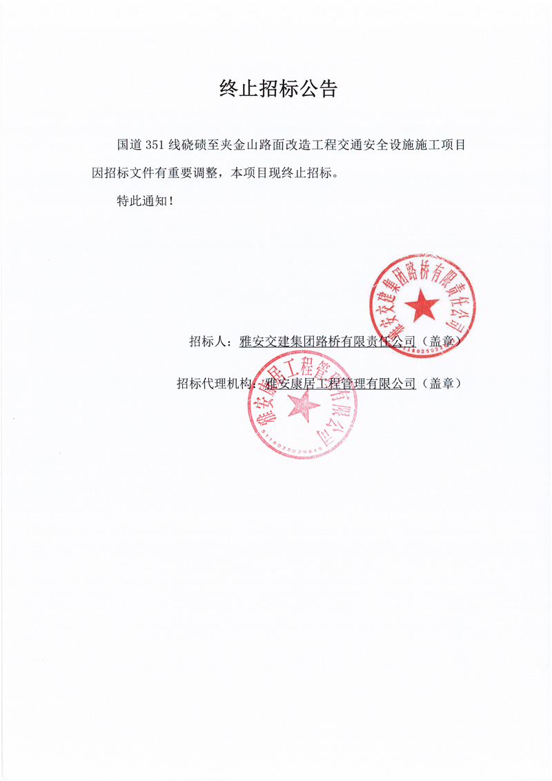 DB视讯 集团路桥有限责任公司国道351线硗碛至夹金山段路面改造工程交通安全设施施工项目终止招标公告