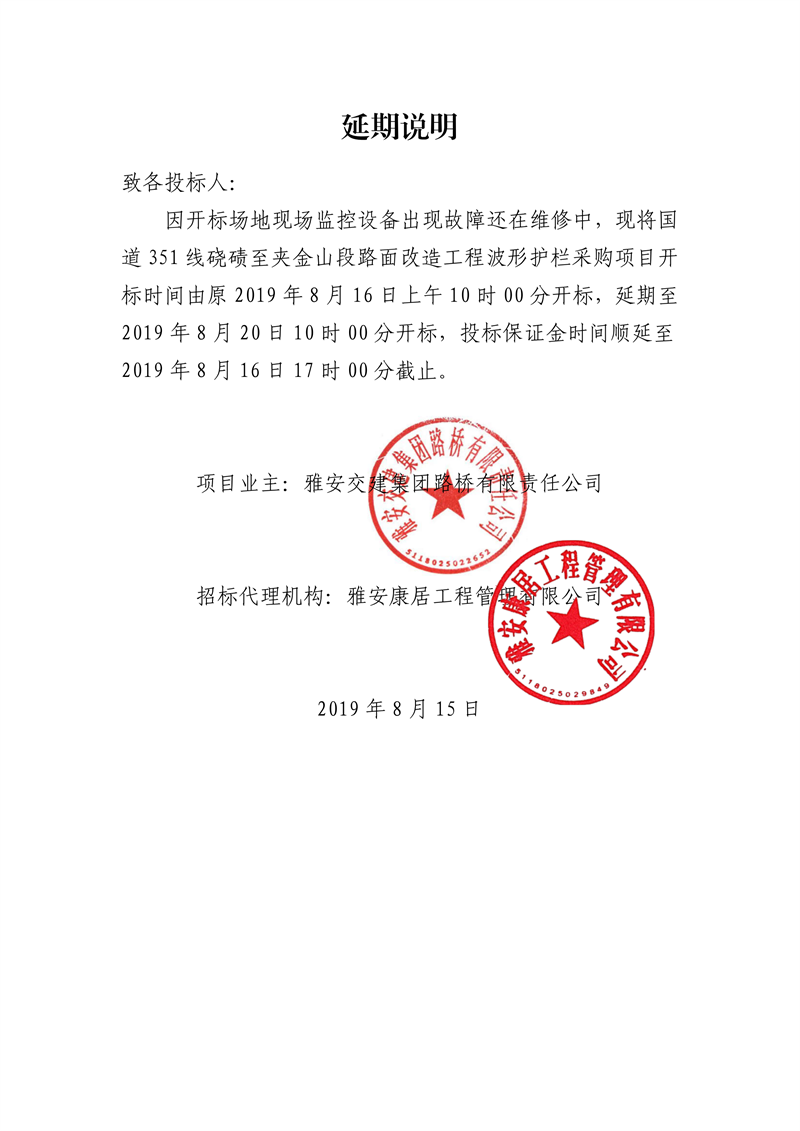 DB视讯 集团路桥有限责任公司国道351线硗碛至夹金山段路面改造工程波形护栏采购延期说明