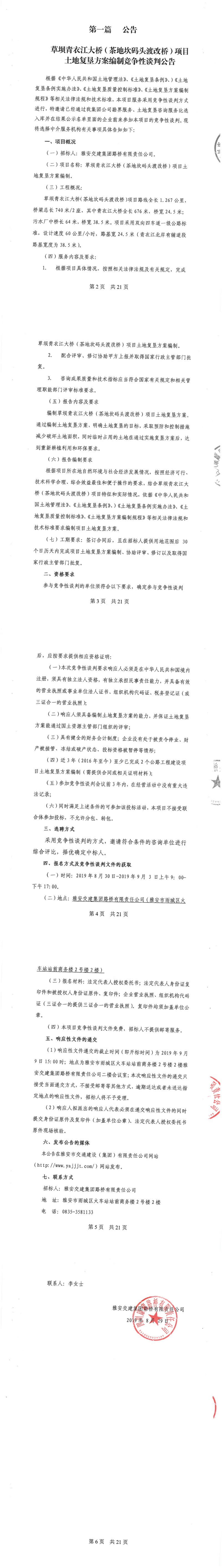 DB视讯 集团路桥有限责任公司草坝青衣江大桥(茶地坎码头渡改桥)土地复垦方案编制竞争性谈判公告