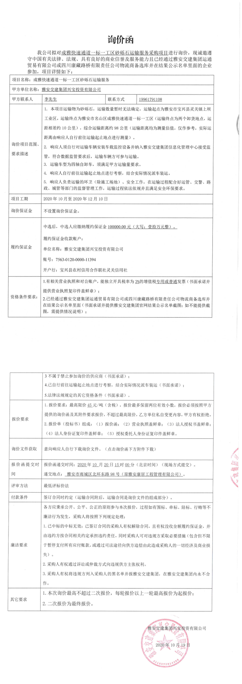 DB视讯 集团兴宝投资有限公司成雅快速通道一标一工区砂砾石运输服务采购项目询价函