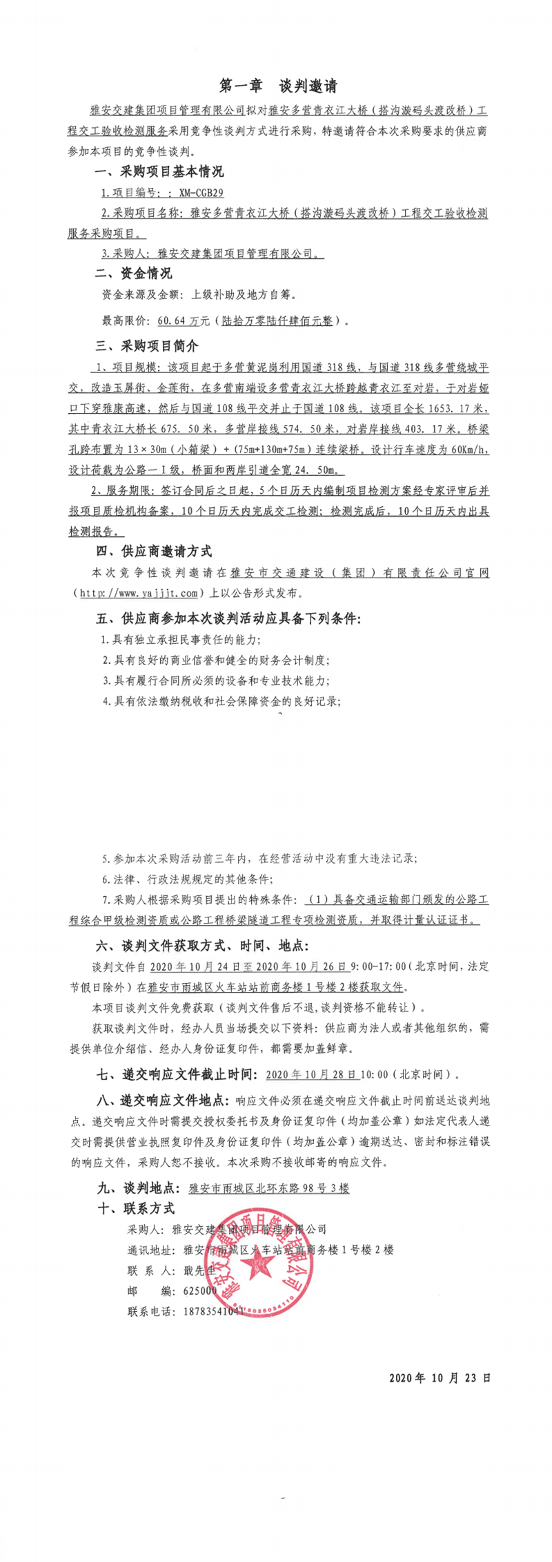 DB视讯 集团项目管理有限公司雅安多营青衣江大桥(搭沟漩码头渡改桥)工程交工验收检测服务采购项目竞争性谈判公告