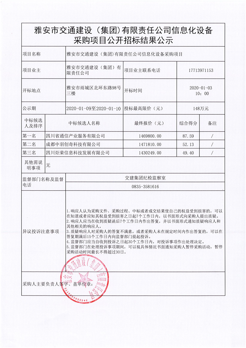 雅安市交通建设(集团)有限责任公司信息化设备采购项目公开招标结果公示