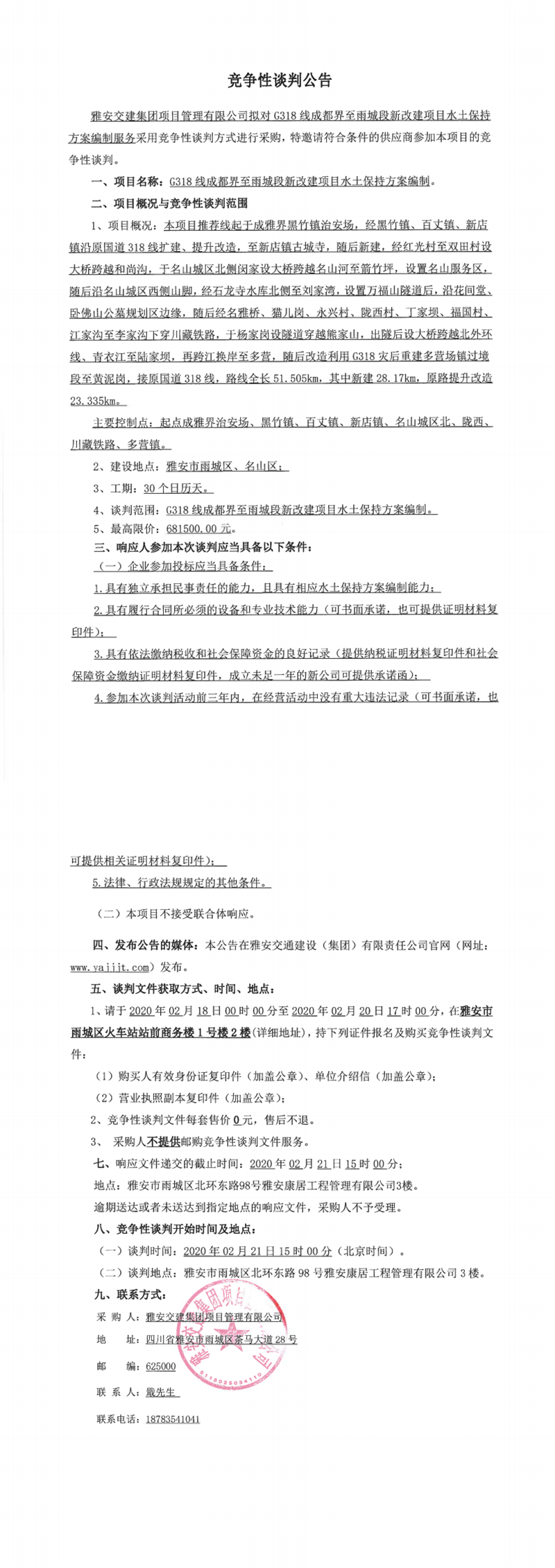 DB视讯 集团项目管理有限公司G318线成都界至雨城段新改建项目水土保持方案编制竞争性谈判公告