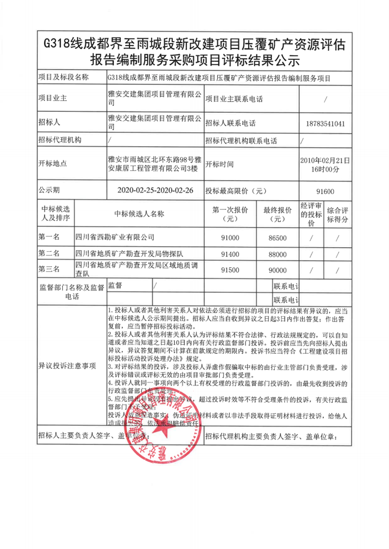 DB视讯 集团项目管理有限公司G318线成都界至雨城段新改建项目压覆矿产资源评估报告编制服务采购项目评标结果公示