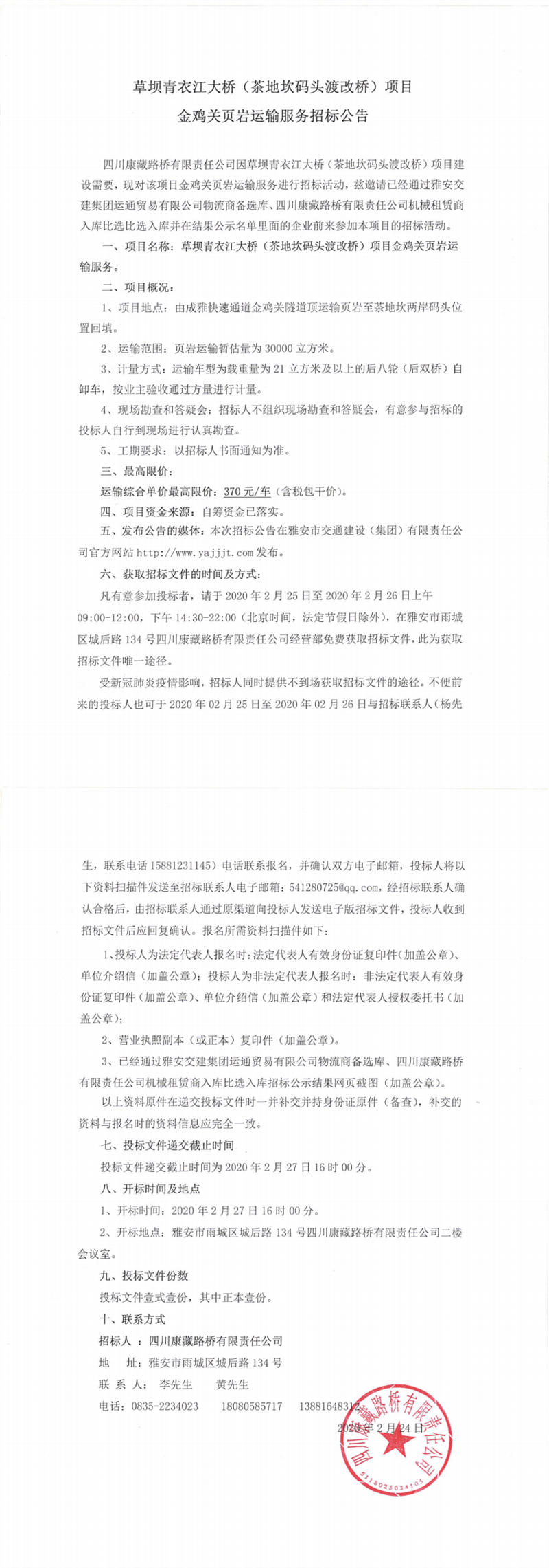 四川康藏路桥有限责任公司草坝青衣江大桥(茶地坎码头渡改桥)项目金鸡关页岩运输服务招标公告