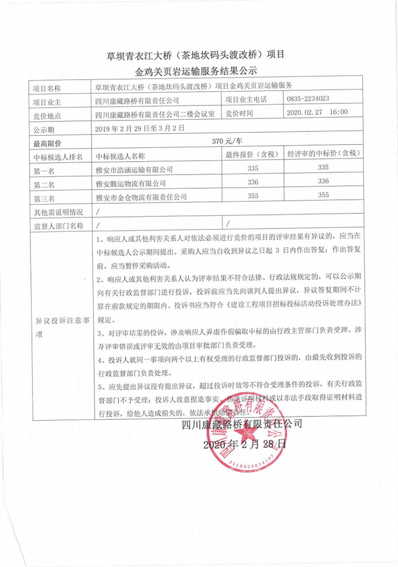 四川康藏路桥有限责任公司草坝青衣江大桥(茶地坎码头渡改桥)项目金鸡关页岩运输服务结果公示