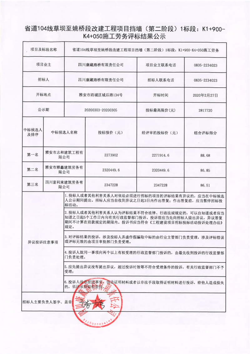 四川康藏路桥有限责任公司省道104线草坝至姚桥段改建工程项目挡墙(第二阶段)1标段:K1+900-K4+050施工劳务评标结果公示