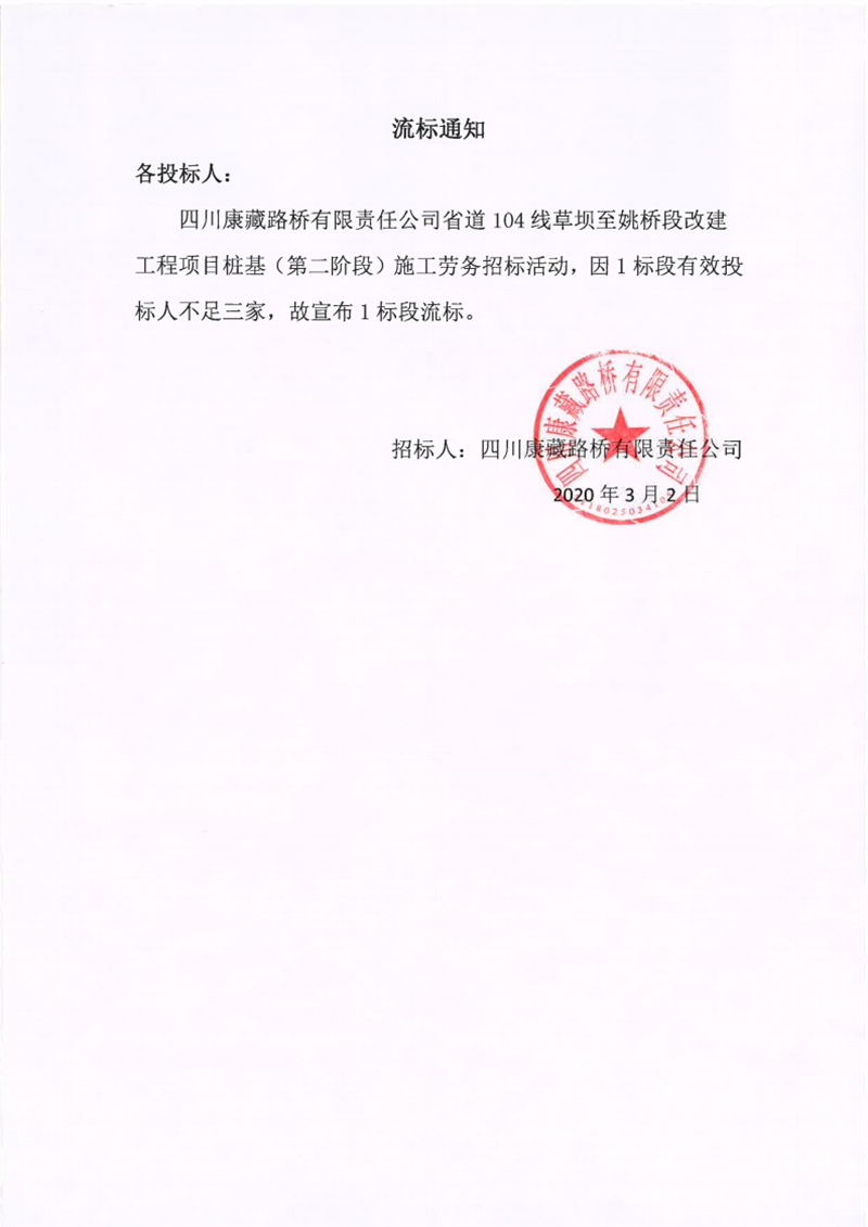 四川康藏路桥有限责任公司省道104线草坝至姚桥段改建工程项目桩基(第二阶段)施工劳务流标通知