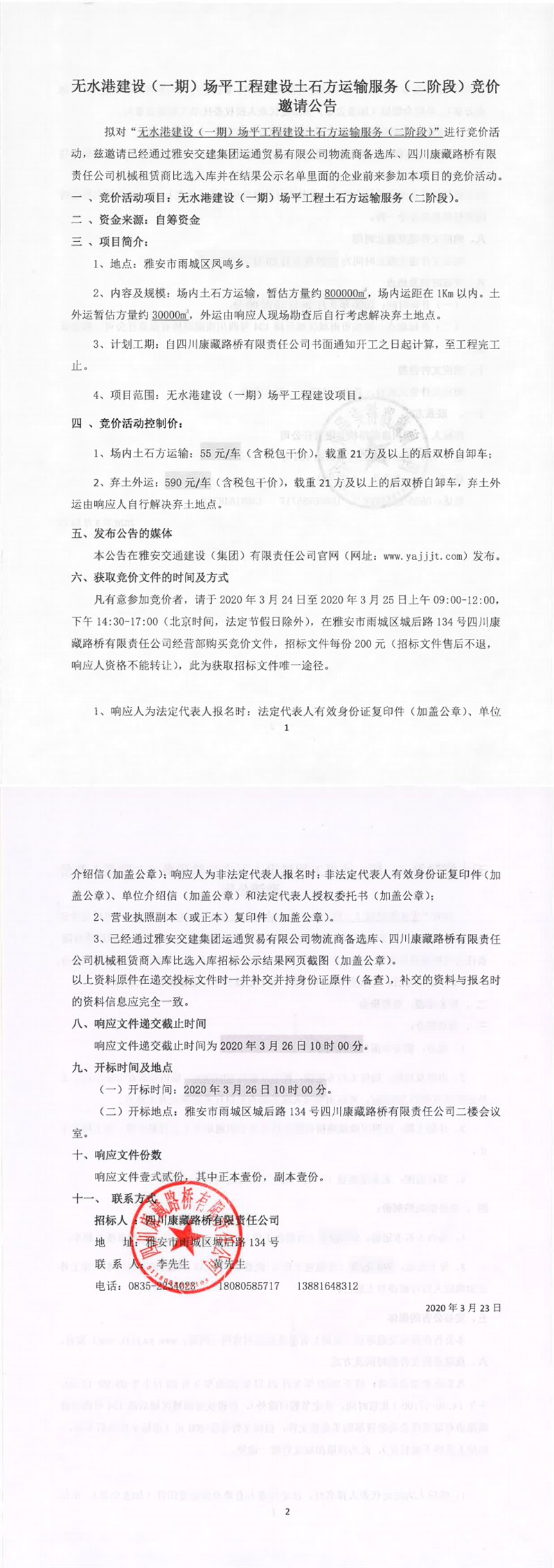 四川康藏路桥有限责任公司无水港建设(一期)场平工程建设土石方运输服务(二阶段)竞价邀请公告