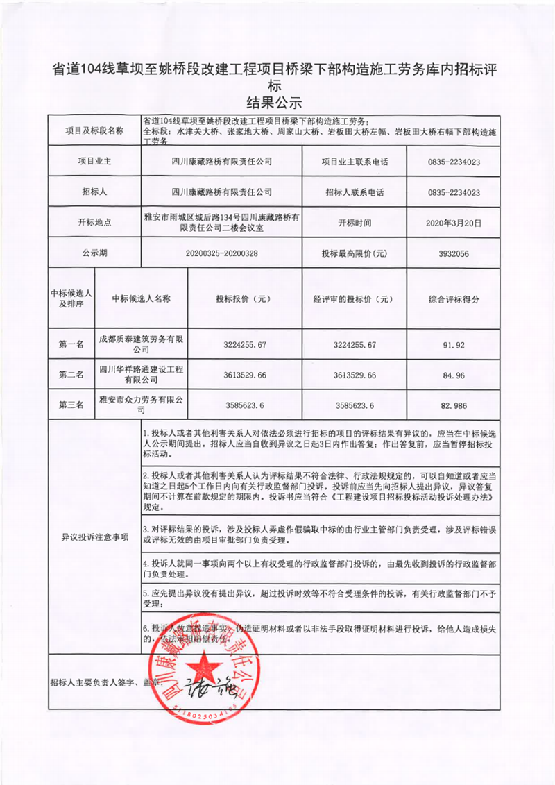 四川康藏路桥有限责任公司省道104线草坝至姚桥段改建工程项目桥梁下部构造施工劳务评标结果公示