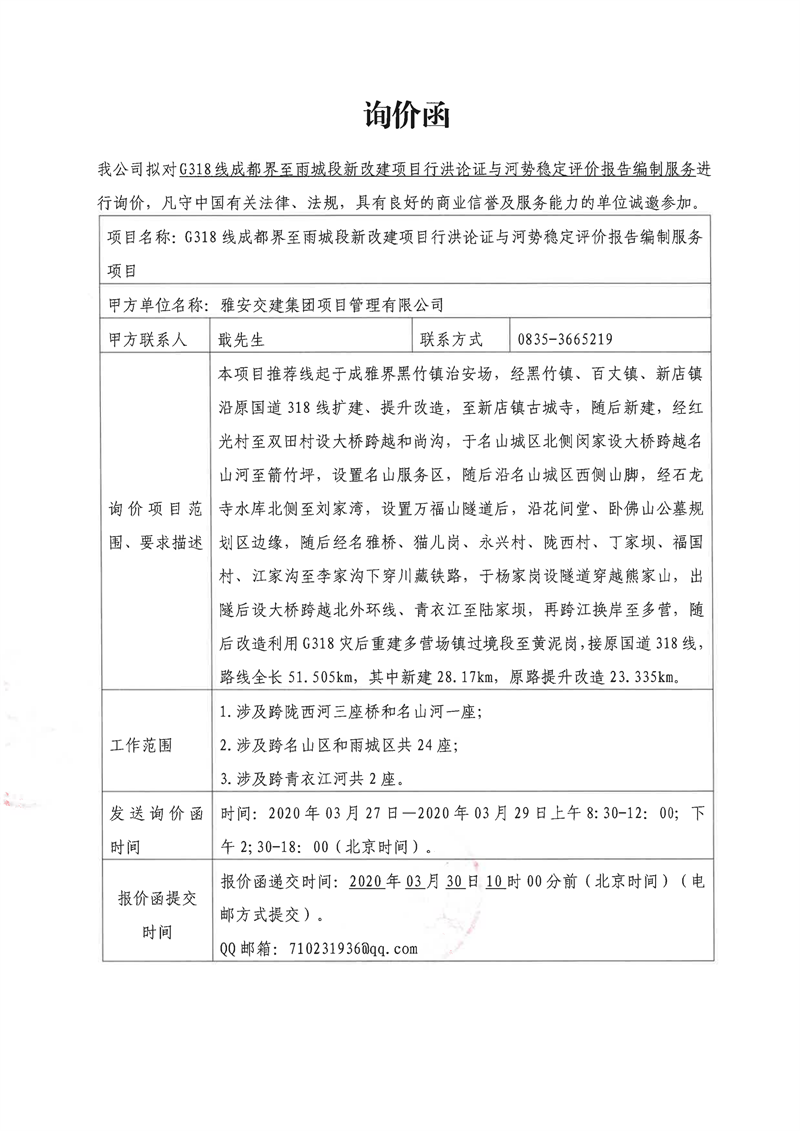DB视讯 集团项目管理有限公司G318线成都界至雨城段新改建项目行洪论证与河势稳定评价报告编制服务项目询价函