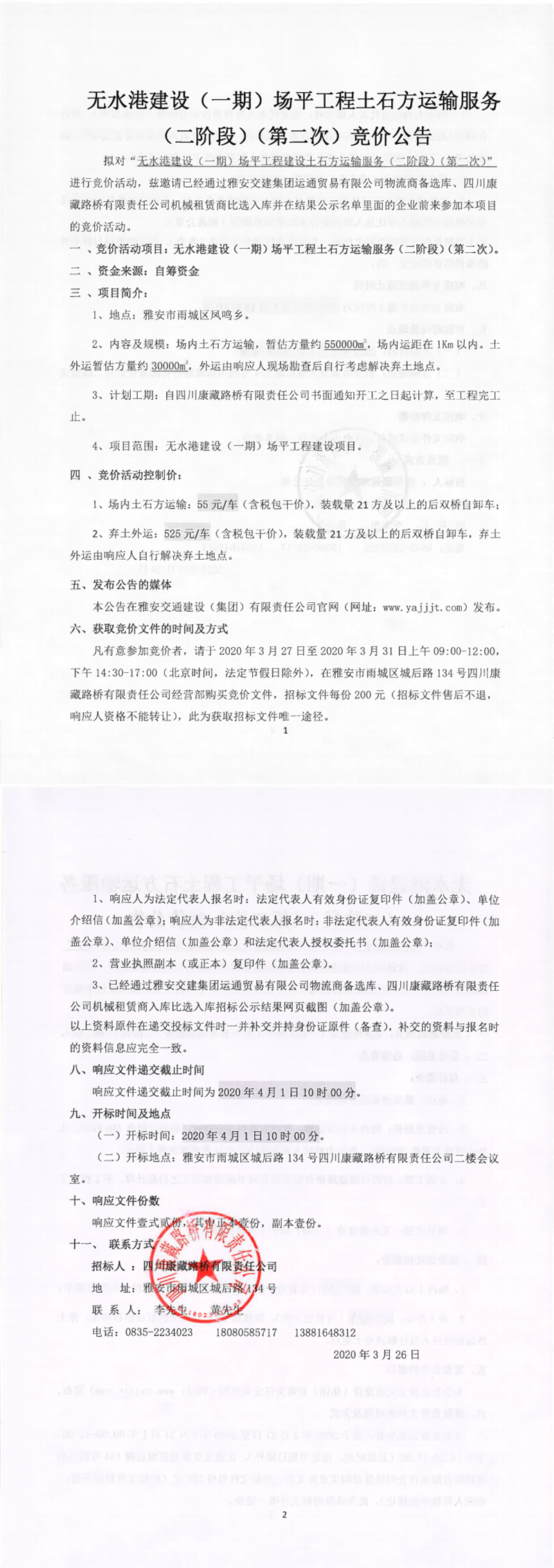 四川康藏路桥有限责任公司无水港建设(一期)场平工程建设土石方运输服务(二阶段)(第二次)竞价公告