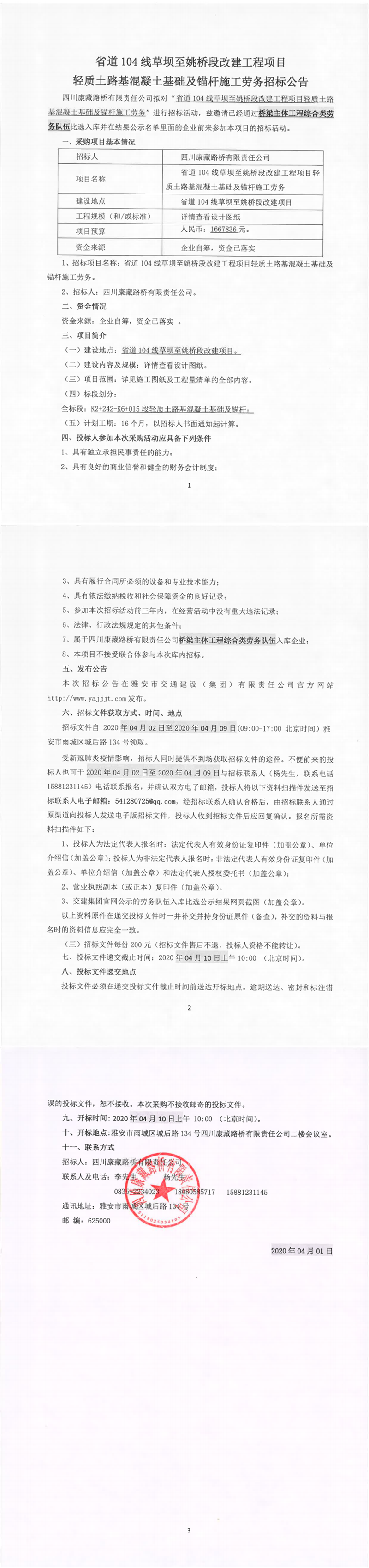 四川康藏路桥有限责任公司省道104线草坝至姚桥段改建工程项目轻质土路基混凝土基础及锚杆施工劳务招标公告