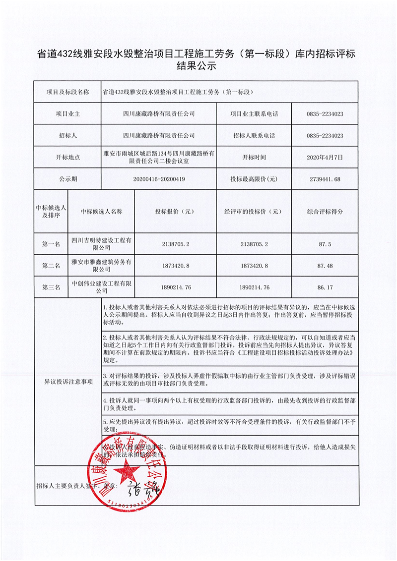 四川康藏路桥有限责任公司省道432线雅安段水毁整治项目工程施工劳务(第一标段)库内招标评标结果公示