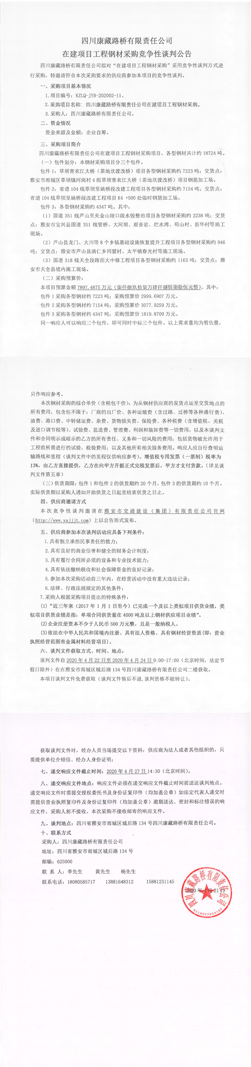 四川康藏路桥有限责任公司在建项目工程钢材采购竞争性谈判公告