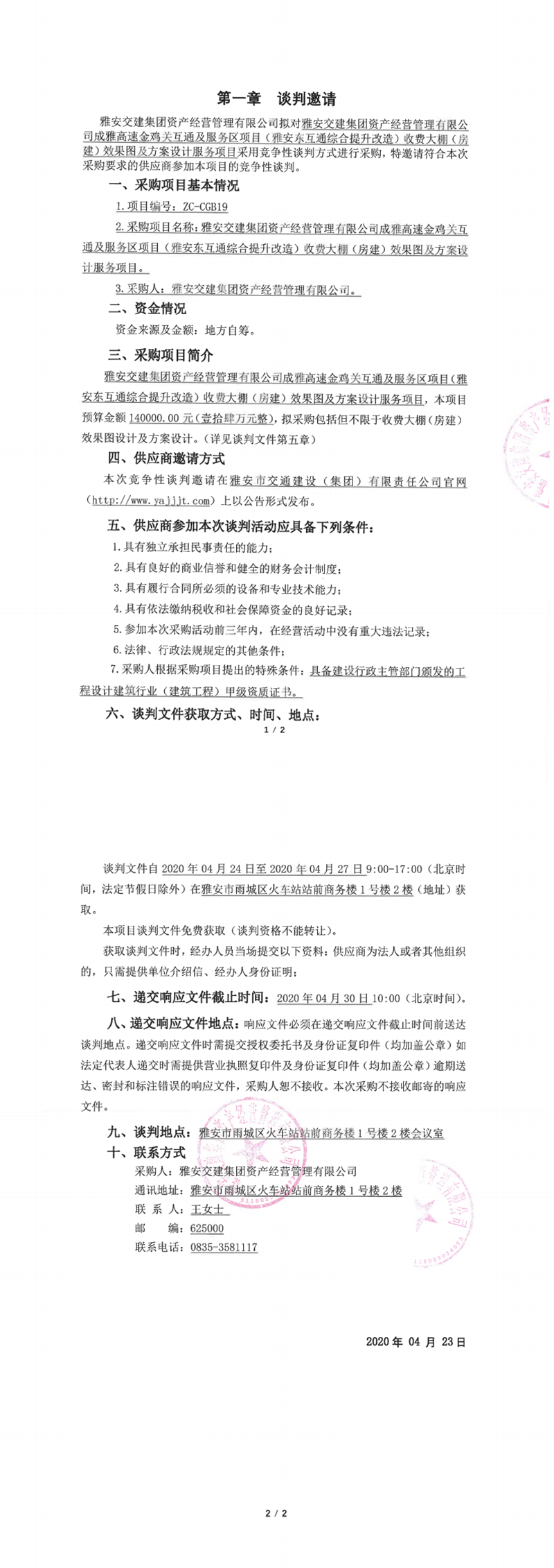 DB视讯 集团资产经营管理有限公司成雅高速金鸡关互通及服务区项目(雅安东互通综合提升改造)收费大棚(房建)效果图及方案设计服务项目竞争性谈判公告