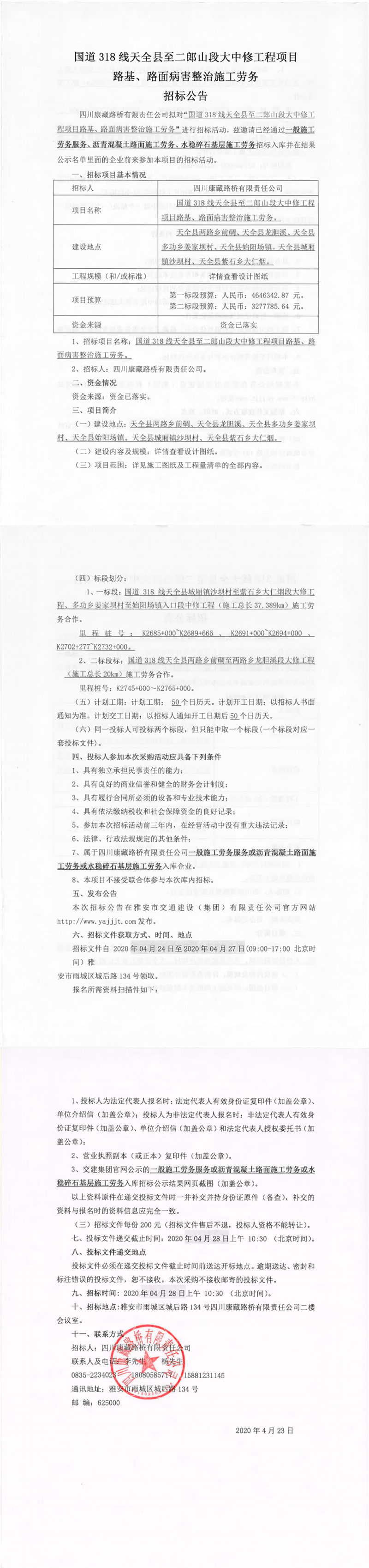 四川康藏路桥有限责任公司国道318线天全县至二郎山段大中修工程项目路基、路面病害整治施工劳务招标公告
