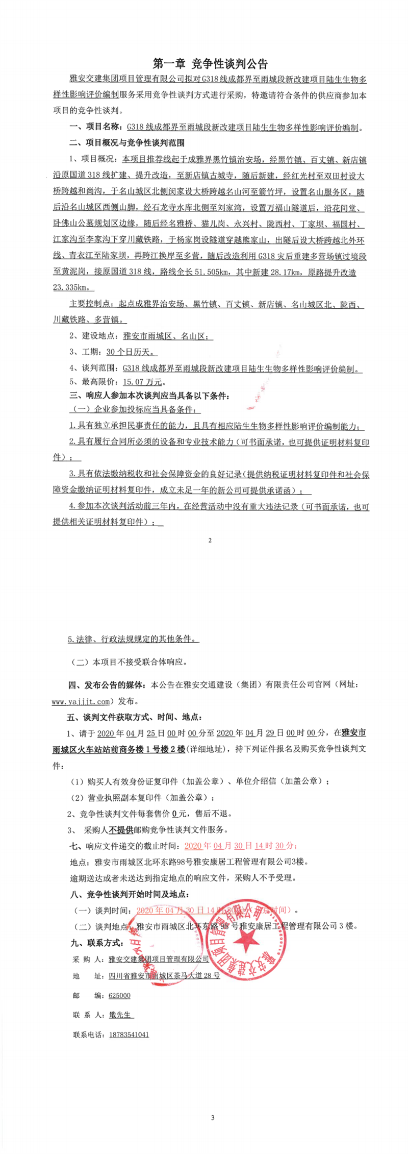 DB视讯 集团项目管理有限公司G318线成都界至雨城段新改建项目陆生生物多样性影响评价编制竞争性谈判公告