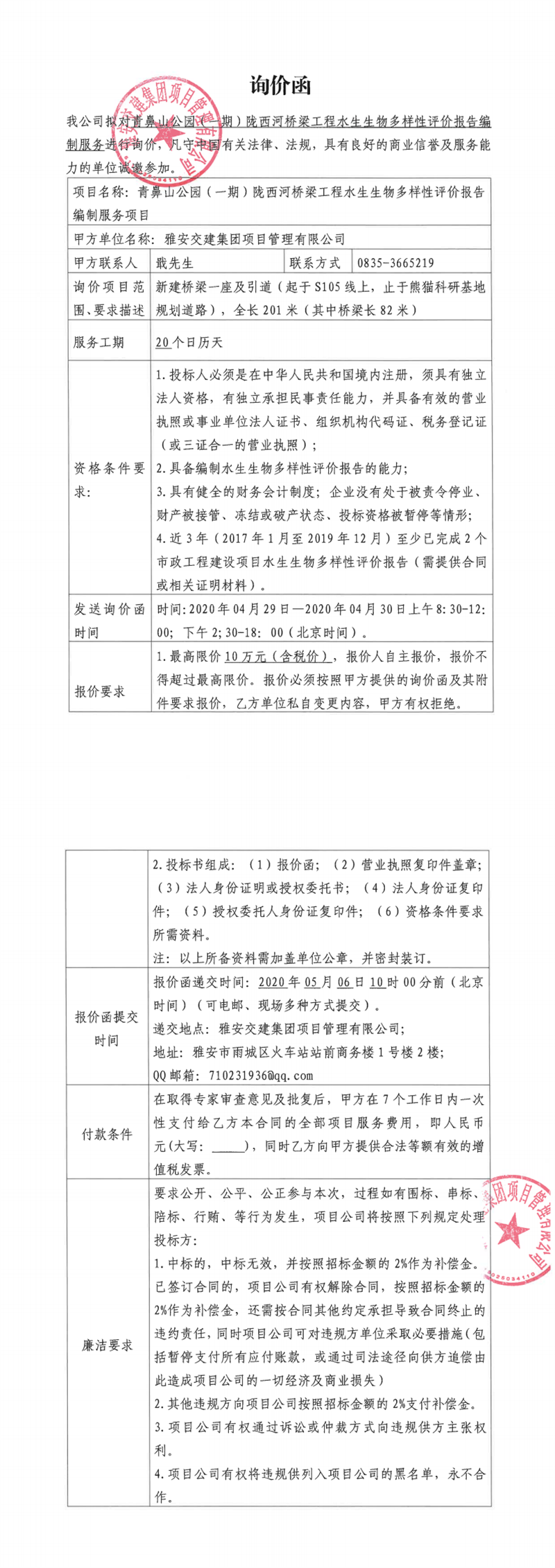 DB视讯 集团项目管理有限公司青鼻山公园(一期)陇西河桥梁工程水生生物多样性评价报告编制服务项目询价函