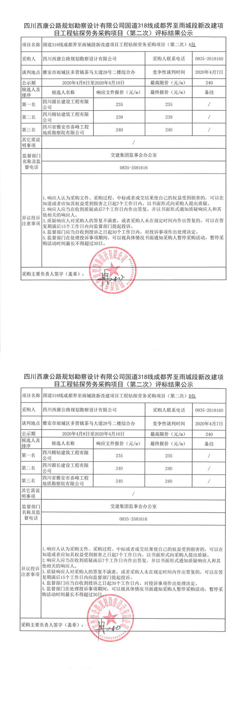 四川西康公路规划勘察设计有限公司国道318线成都界至雨城段新改建项目工程钻探劳务采购项目(第二次)评标结果公示