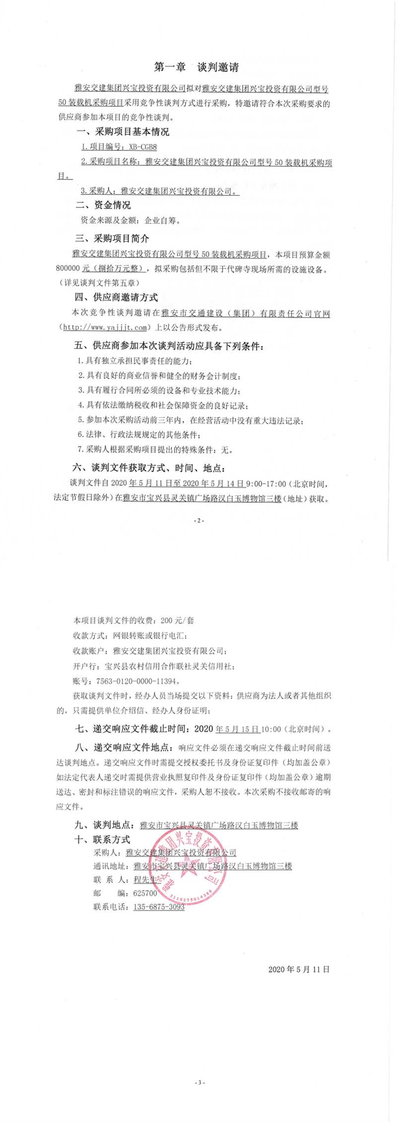 DB视讯 集团兴宝投资有限公司型号50装载机采购项目竞争性谈判公告