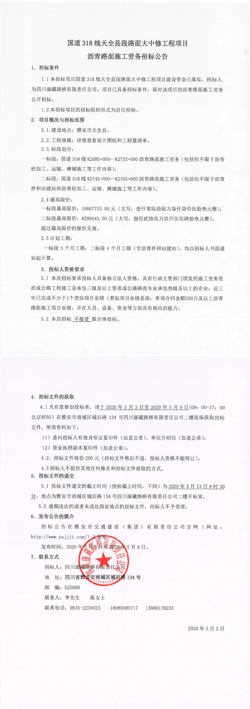 四川康藏路桥有限责任公司国道318线天全县段路面大中修工程项目沥青路面施工劳务招标公告