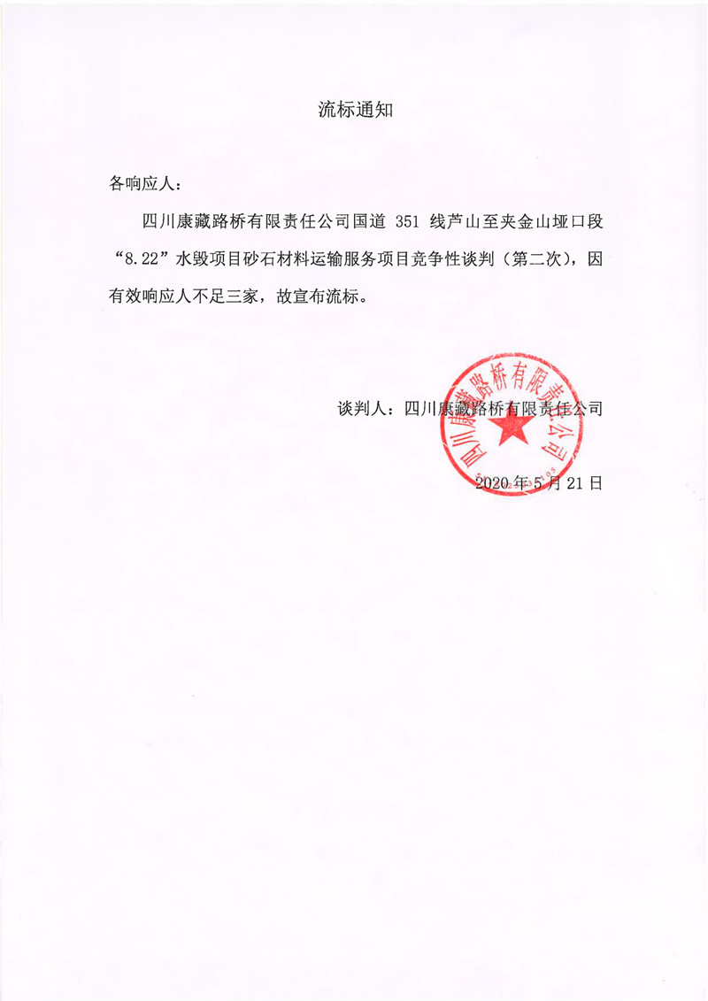 四川康藏路桥有限责任公司国道351线芦山至夹金山垭口段8.22水毁项目砂石材料运输服务项目(第二次)流标通知