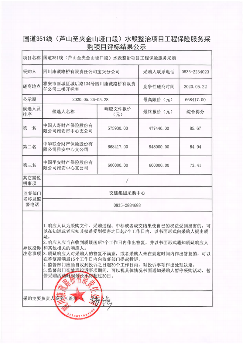 四川康藏路桥有限责任公司宝兴分公司国道351线(芦山至夹金山垭口段)水毁整治项目工程保险服务采购项目评标结果公示