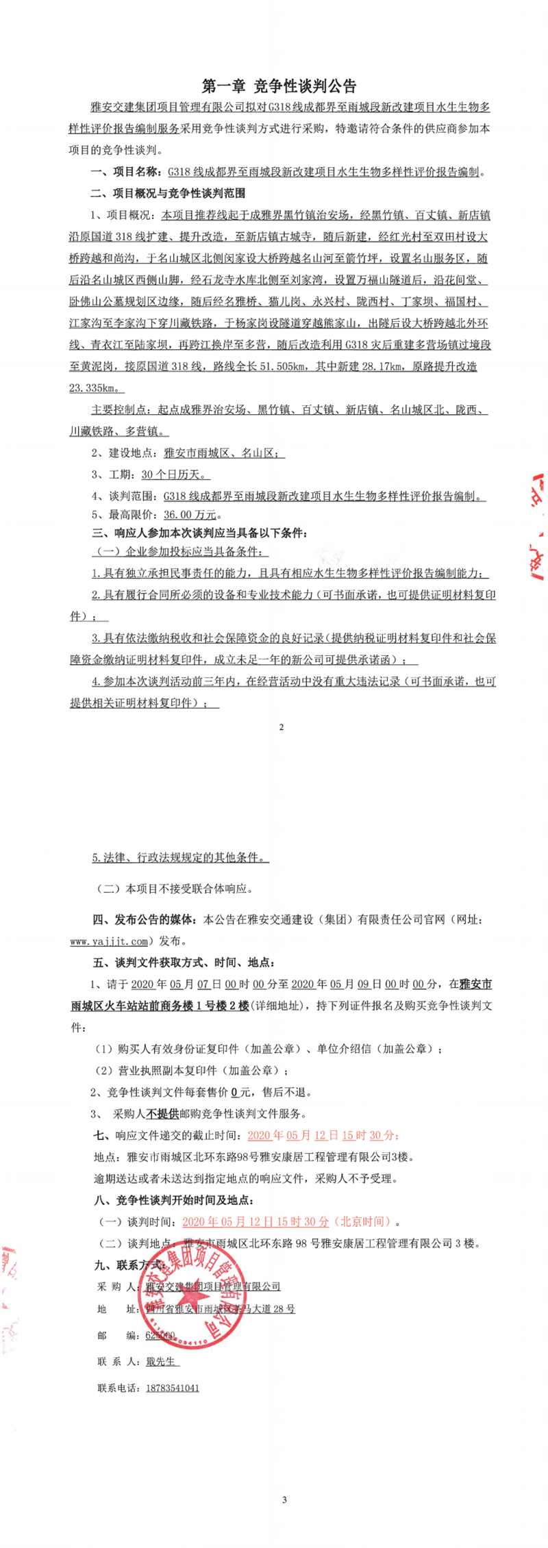 DB视讯 集团项目管理有限公司G318线成都界至雨城段新改建项目水生生物多样性评价报告编制竞争性谈判(第二次)公告